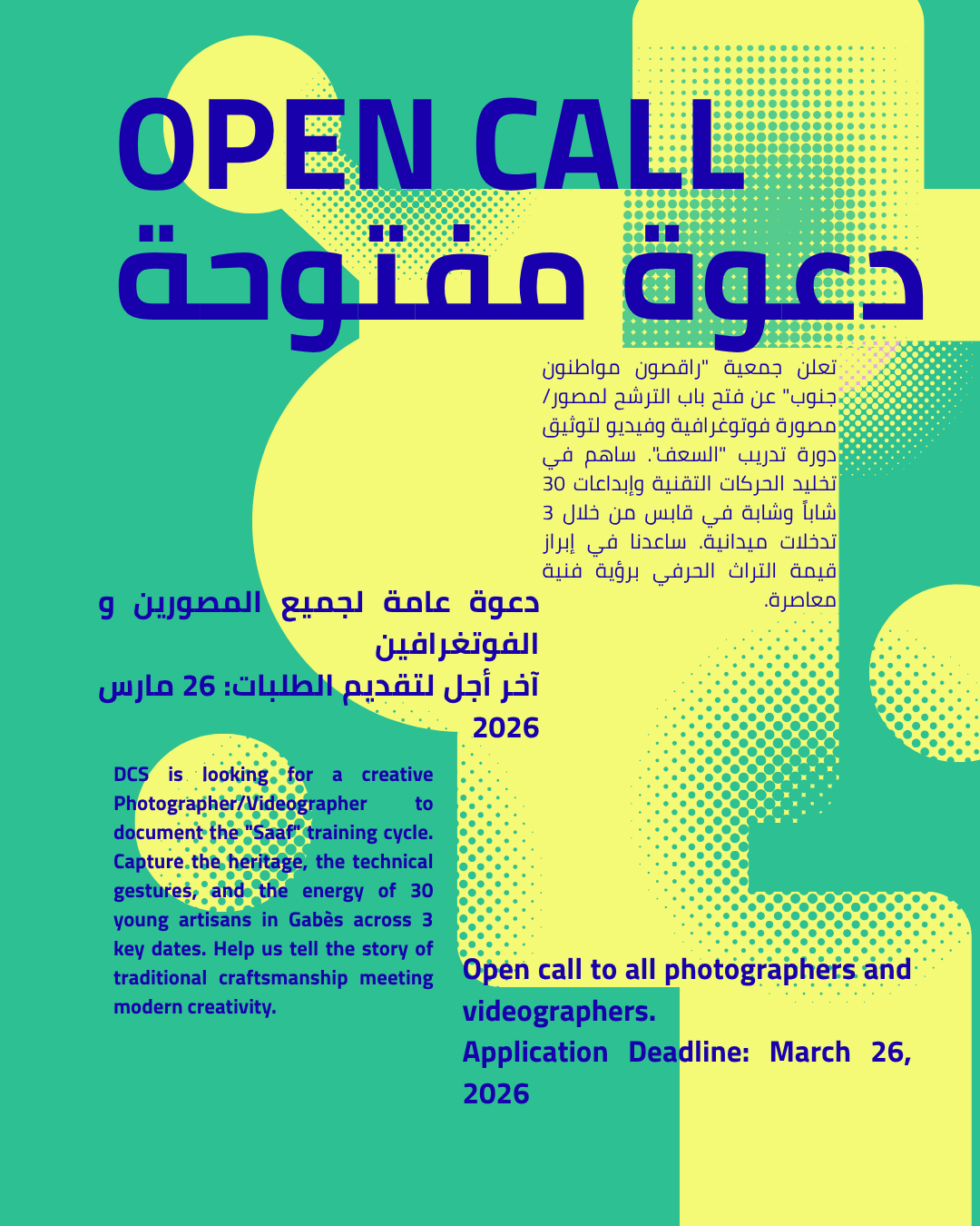 Capture the soul of our "Saaf" workshop. We need a creative eyes to document the technical gestures and group energy across 3 key dates in Gabès. Professional portfolio required.